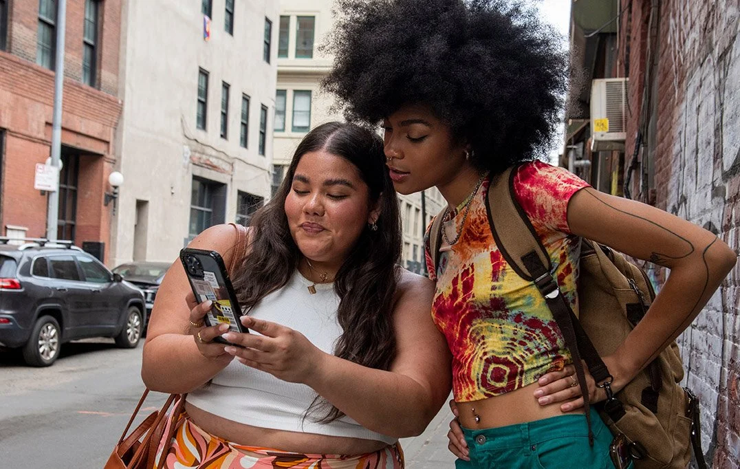 Two women looking at a smartphone on the streets of lower Manhattan. Photo by Cultura Creative https://stock.adobe.com/
