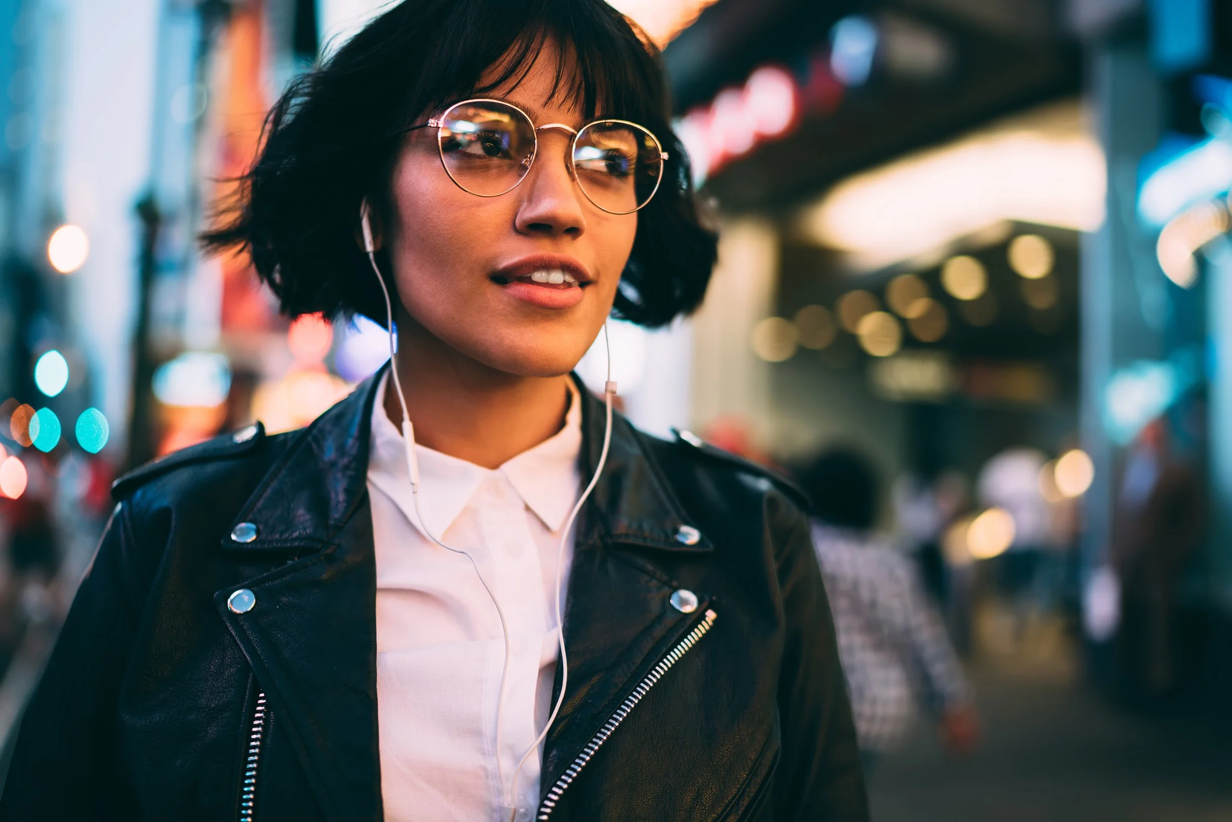 Woman in leather jacket, glasses and ear buds walks through Times Square. Photo by BullRun stock.adobe.com/